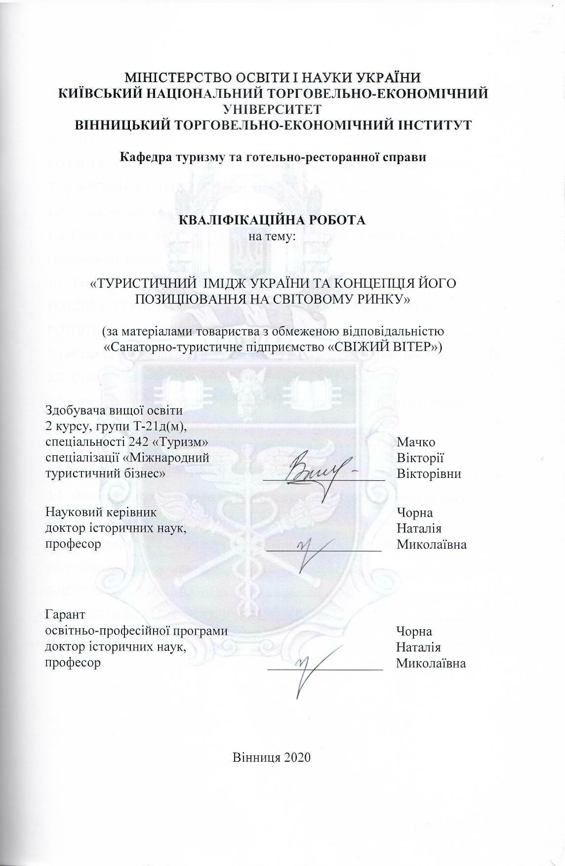 | Назва: | Туристичний імідж України та концепція його позиціювання на світовому ринку (за матеріалами товариства з обмеженою відповідальністю "Санаторно-туристичне підприємство "Свіжий вітер"") |