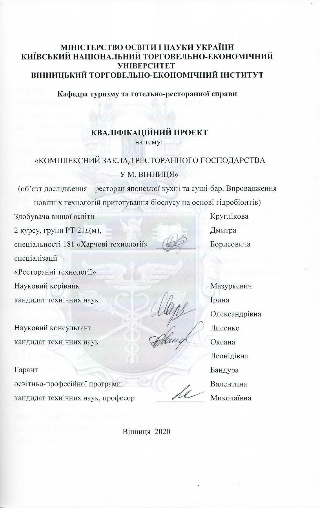 | Назва: | Комплексний заклад ресторанного господарства у м. Вінниця (об'єкт дослідження - ресторан японської кухні та суші-бар. Впровадження новітніх технологій приготування біосоусу на основі гідробіонтів) |