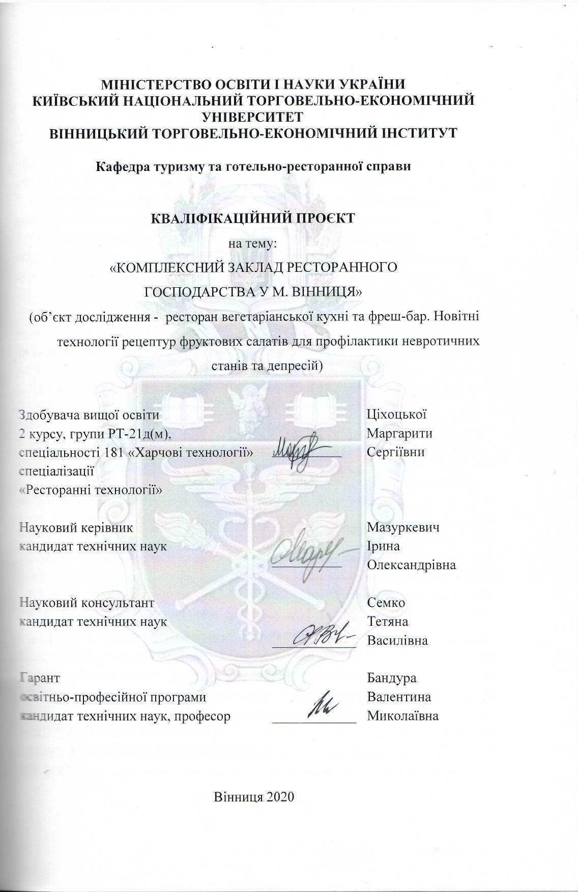 | Назва: | Комплексний заклад ресторанного господарства у м. Вінниця (об'єкт дослідження - ресторан вегетаріанської кухні та фреш-бар. Новітні технології рецептур фруктових салатів для профілактики невротичних станів та депресій) |