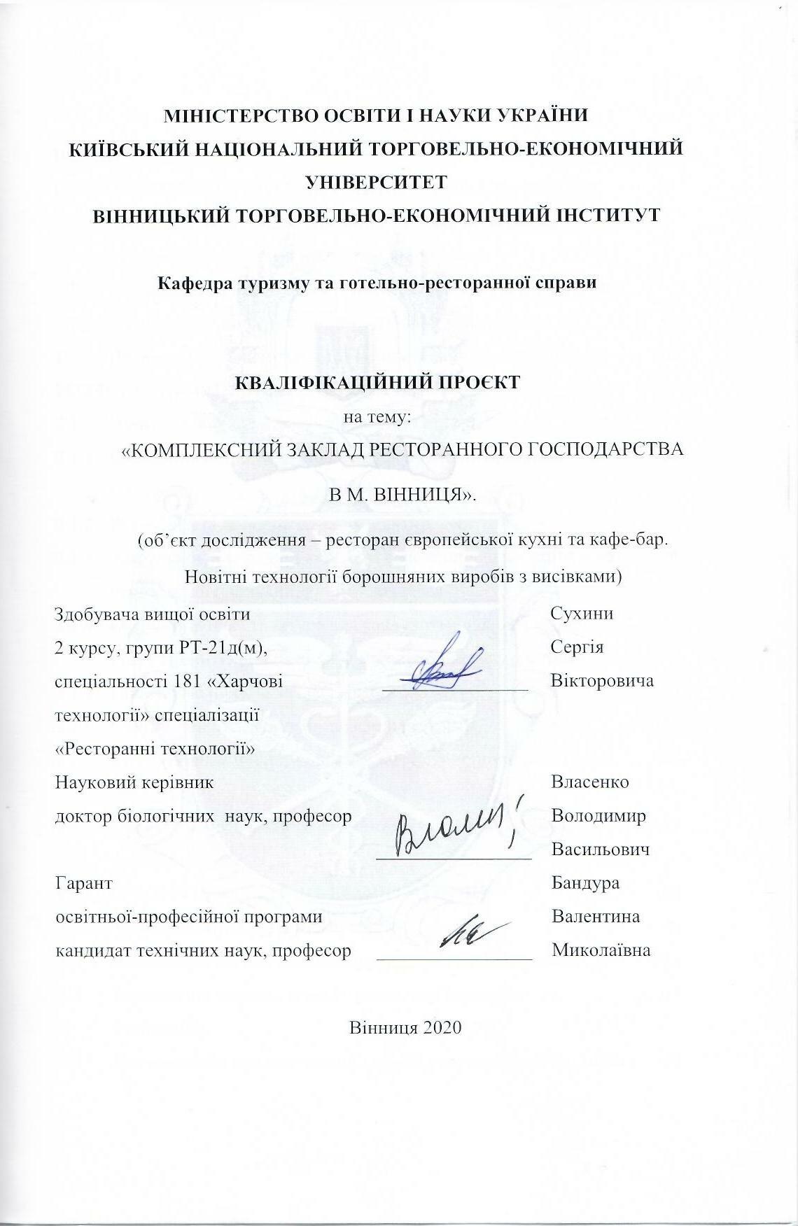 | Назва: | Комплексний заклад ресторанного господарства в м. Вінниця (об'єкт дослідження - ресторан європейської кухні та кафе-бар. Новітні технології борошняних виробів з висівками) |
