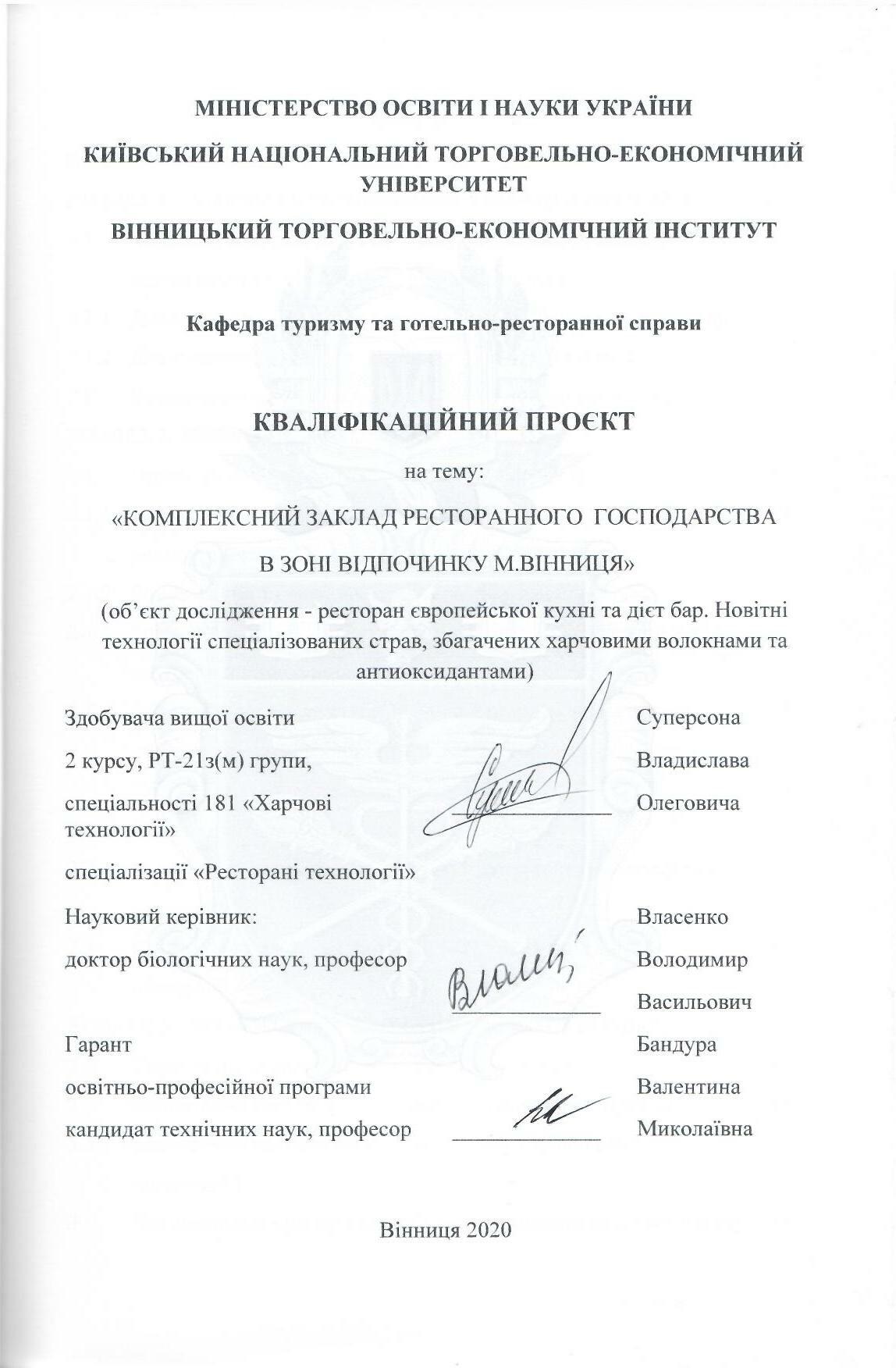 | Назва: | Комплексний заклад ресторанного господарства в зоні відпочинку м. Вінниця (об'єкт дослідження - ресторан європейської кухні та дієт бар. Новітні технології спеціалізованих страв, збагачених харчовими волокнами та антиоксидантами) |