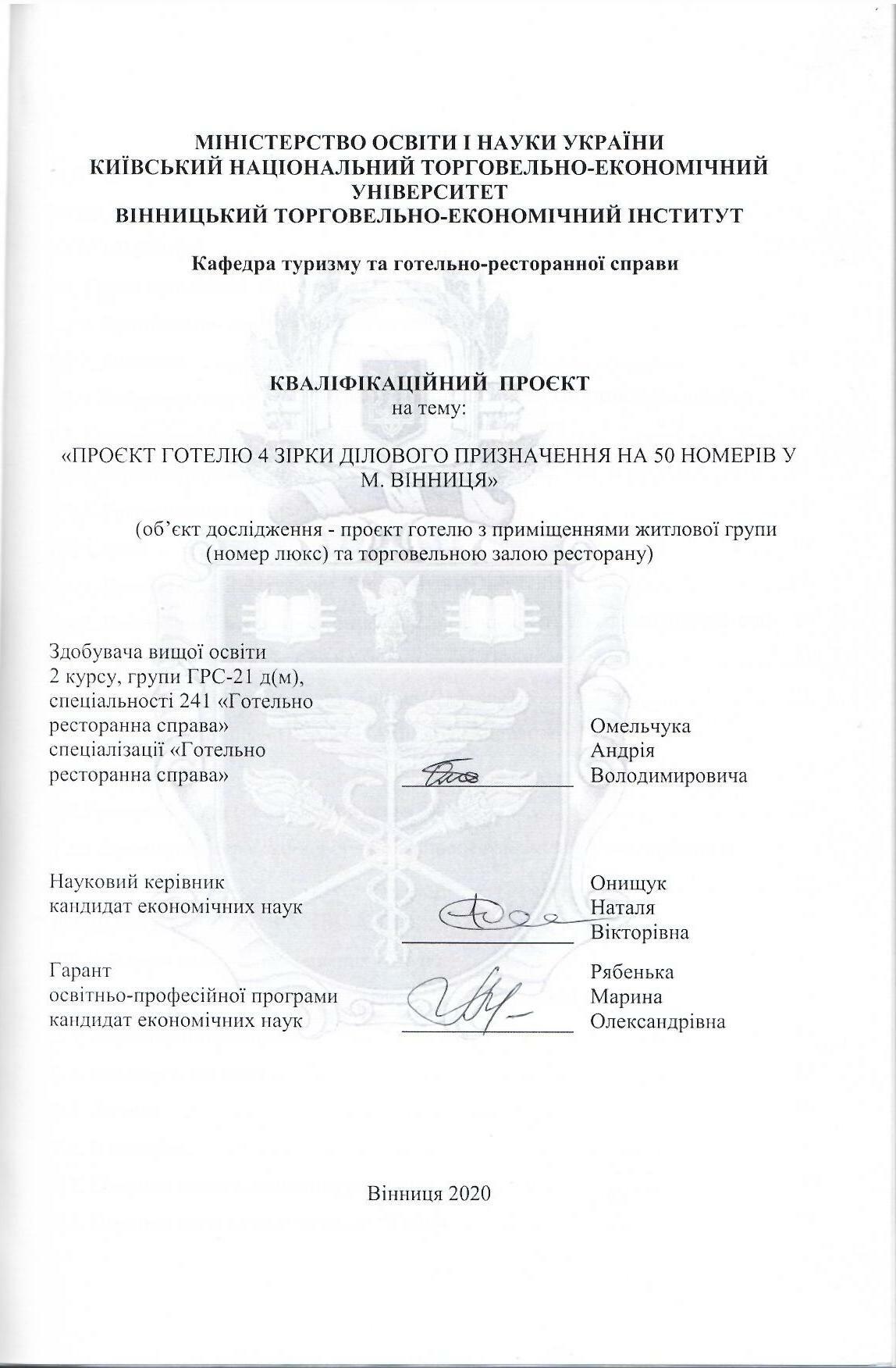 | Назва: | Проєкт готелю 4 зірки ділового призначення на 50 номерів у м. Вінниця (об'єкт дослідження - проєкт готелю з приміщеннями житлової групи (номер люкс) та торговельною залою ресторану) |