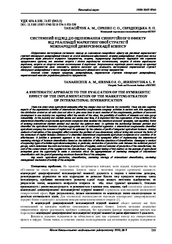 | Title: | Системний підхід до оцінювання синергійного ефекту від реалізації маркетингової стратегії міжнародної диверсифікації бізнесу=A systematic approach to the evaluation of the synergistic effect of the implementation of the marketing strategy of international |