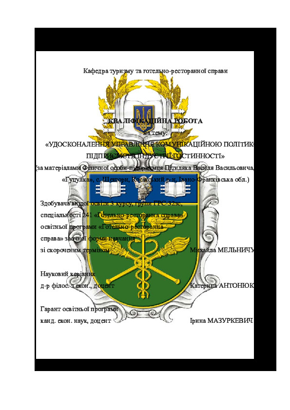 | Title: | Удосконалення управління комунікаційною політикою підприємств індустрії гостинності (за матеріалами фізичної особи-підприємця Пітиляка Василя Васильовича, садиба «Гуцулка», с. Шешори, Косівський р-н, Івано-Франківська обл.) |