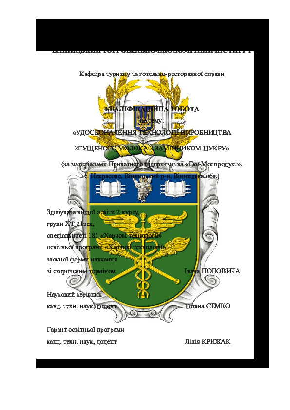 | Title: | Удосконалення технології виробництва згущеного молока з замінником цукру (за матеріалами Приватного підприємства «Еко-Молпродукт», с. Некрасове, Вінницький р-н, Вінницька обл.) |