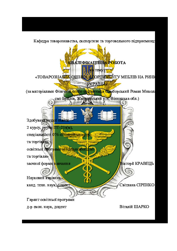 | Title: | Товарознавча оцінка асортименту меблів на ринку України (за матерілами фізичної особи-підприємця Самборський Роман Миколайович, смт Браїлів, Жмеринський р-н, Вінницька обл. |