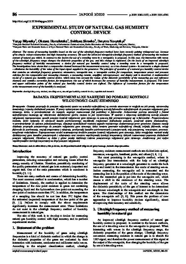 | Summary: | The means of measuring humidity based on the use of the ultrahigh frequency method have been recently gaining widespread use, because of its simple, robust construction and high measuring accuracy. We used the advanced waveguide ultrahigh frequency method of measuring the moisture content of natural gas which, in contrast to the known the use of a traveling wave in a waveguide, is proposed. In this case, the interaction with waves of the ultrahigh frequency range changes the dielectric properties of the gas, and this change is registered. On the basis of an improved ultrahigh frequency method of humidity measurement, a device for natural gas humidity control using a traveling wave in a waveguide is proposed. The investigations have shown that a comparative channel increased the measurement accuracy, as a two-channel system – in contrast to a single-channel – eliminates the instability of the value of the input signal supplied to the generator. The principle of operation of a natural gas humidity control device that contains an ultrahigh frequency generator, attenuators, waveguide tees, a waveguide section for comparison, temperature sensor and pressure switches for the comparative and measuring channels, a measuring cuvette, amplifier, microprocessor, and display unit is described. A mathematical model of a natural gas humidity control device, which takes into account the values of the dielectric permittivity of the measuring gas and reference channels and contains correction factors for temperature, the use of which increases the accuracy of humidity measurement, is proposed. The lower and upper calibration points of the natural gas humidity control device are defined. The influence of correction factors for the temperature at the measurement error of the humidity is analyzed. |