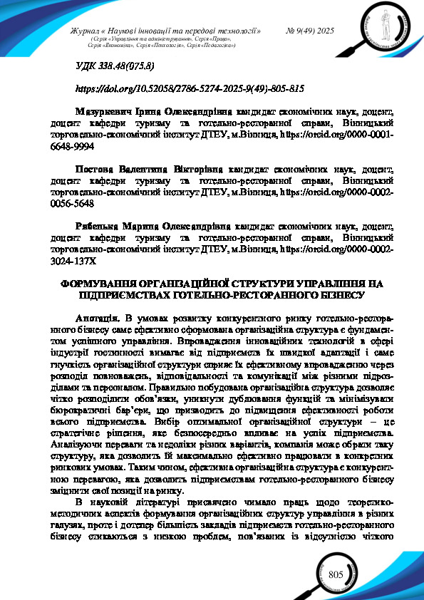 | Title: | Формування організаційної структури управління на підприємствах готельно-ресторанного бізнесу = Developing an organizational management structure for hospitality businesses |