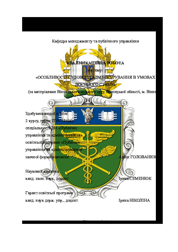 | Title: | Особливості судового адміністрування в умовах воєнного стану (за матеріалами Вінницького міського суду Вінницької області, м. Вінниця) |