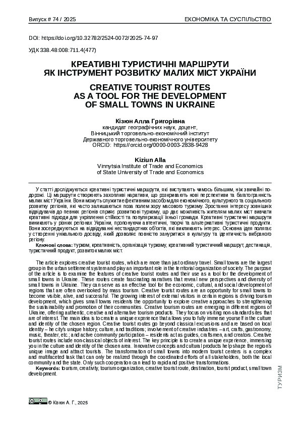 | Keywords: | туризм, креативність, організація туризму, креативний туристичний маршрут, дестинація, туристичний продукт, розвиток малих міст |
