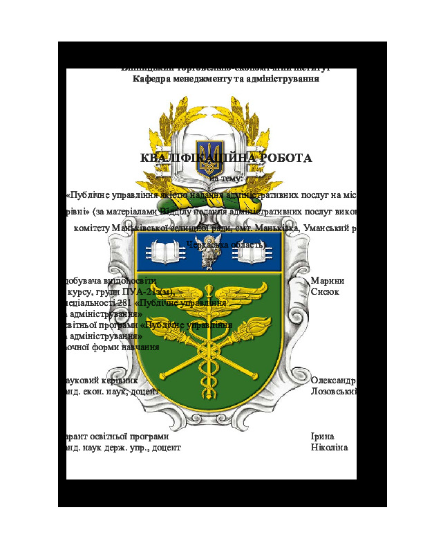 | Title: | Публічне управління якістю надання адміністративних послуг на місцевому рівні (за мат. Відділу надання адмін. послуг виконавчого комітету Маньківської селищної ради, смт. Маньківка, Уманський р-н, Черкаська обл) |