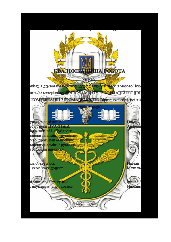 | Title: | Реалізація державної політики щодо діяльності засобів масової інформації в Україні (за матеріалами Департаменту інформаційної діяльності та комунікацій з громадськістю Вінницької ОВА) |