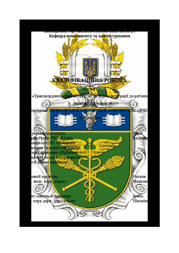 | Title: | Транскордонне співробітництво як форма інтеграції до регіонального економічного простору (за матеріалами ГО «Єврорегіон «Дністер», м. Вінниця) |
