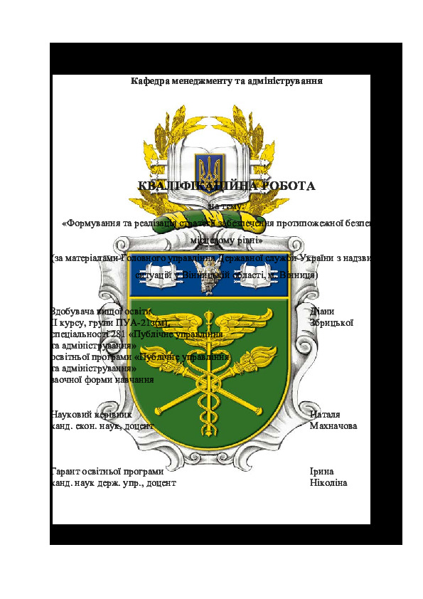 | Назва: | Формування та реалізація стратегії забезпечення протипожежної безпеки на місцевому рівні» (за матеріалами ГУ ДСНС у Вінницькій області, м. Вінниця) |