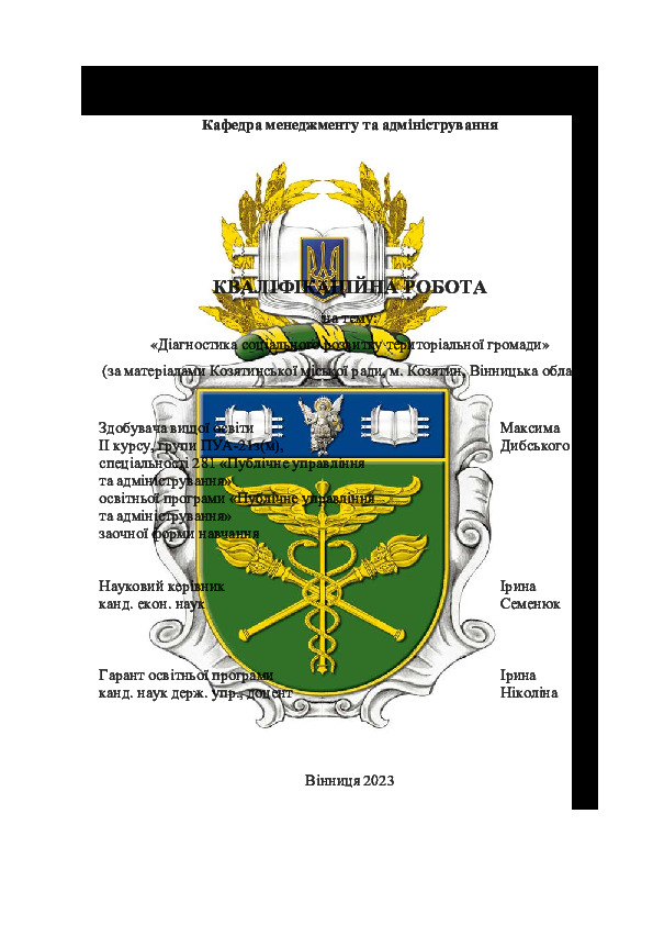 | Title: | Діагностика соціального розвитку територіальної громади (за матеріалами Козятинської міської ради, м. Козятин, Вінницька область |