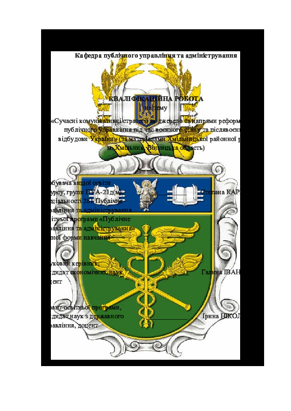 | Title: | Сучасні комунікативні стратегії як джерело та напрями реформування публічного управління під час воєнного стану та післявоєнної відбудови України (за матеріалами Хмільницької районної ради, м. Хмільник, Вінницька область) |