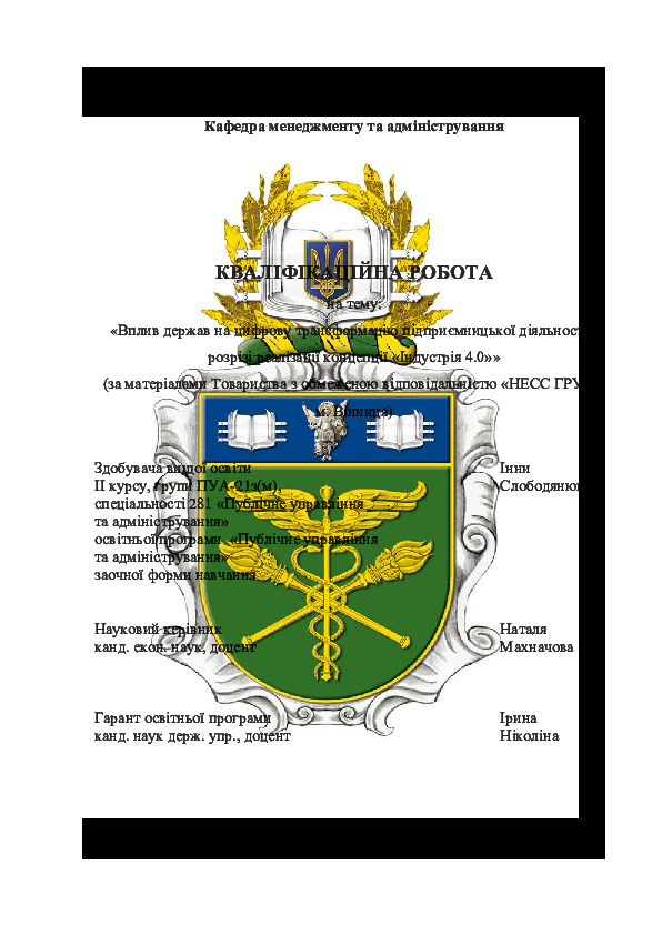 | Title: | Вплив держав на цифрову трансформацію підприємницької діяльності в розрізі реалізації концепції «Індустрія 4.0» (за матеріалами ТОВ «НЕСС ГРУП», м. Вінниця) |