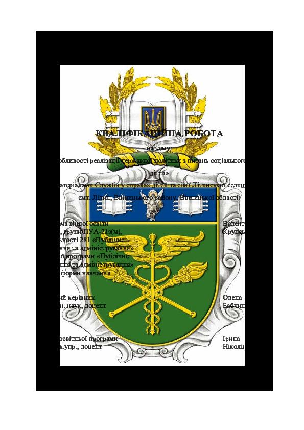 | Title: | Особливості реалізації державної політики з питань соціального захисту дітей (за матеріалами Служби у справах дітей та сім`ї Літинської селищної ради, смт. Літин, Вінницького району, Вінницької області) |