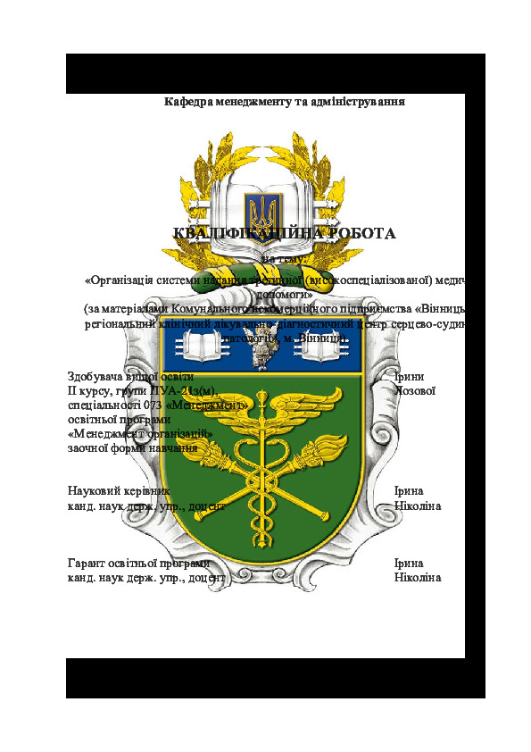 | Title: | Організація системи надання третинної (високоспеціалізованої) медичної допомоги (за матеріалами Комунального некомерційного підприємства «Вінницький регіональний клінічний лікувально-діагностичний центр серцево-судинної патології», м. Вінниця) |