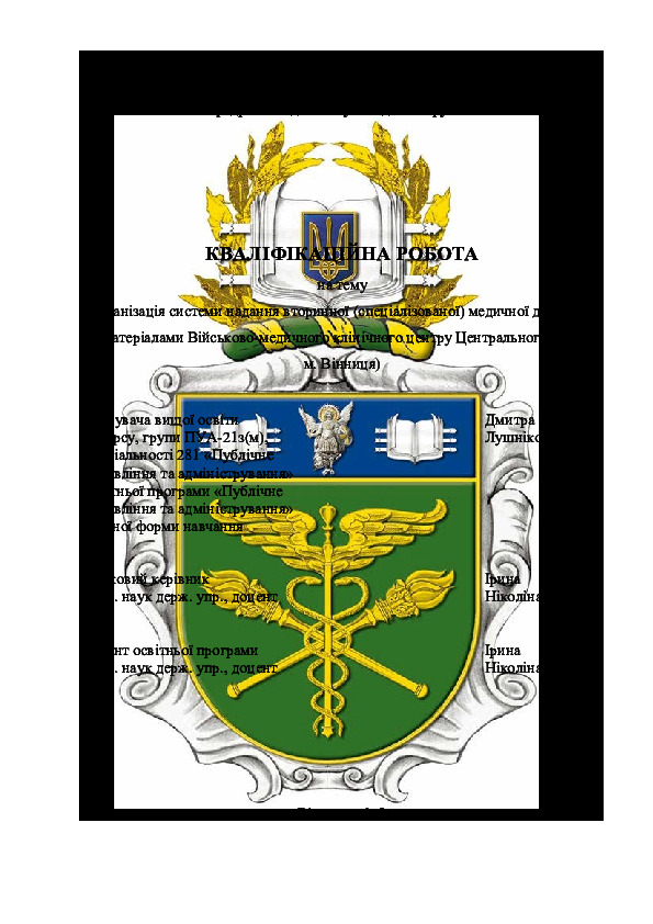 | Title: | Організація системи надання вторинної (спеціалізованої) медичної допомоги (за матеріалами Військово-медичного клінічного центру Центрального регіону, м. Вінниця) |