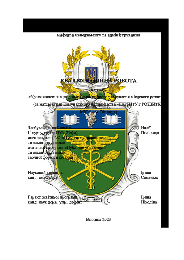| Title: | Удосконалення методології стратегічного планування місцевого розвитку (за матеріалами Комунального підприємства «ІНСТИТУТ РОЗВИТКУ МІСТ», м. Вінниця) |