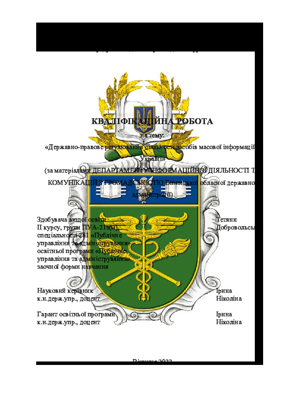 | Title: | Кваліфікаційна робота: Державно-правове регулювання діяльності засобів масової інформації в Україні (за матеріалами департаменту інформаційної діяльності та комунікацій з громадськістю Вінницької обласної державної адміністрації) |