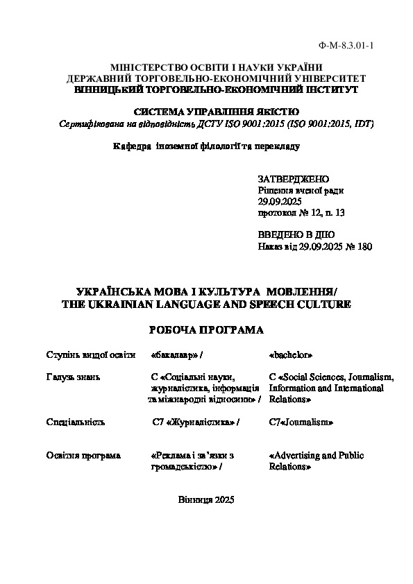 | Видавництво: | : робоча програма. Вінниця : Редакційно-видавничий відділ ВТЕІ ДТЕУ, 2024. 25 с |