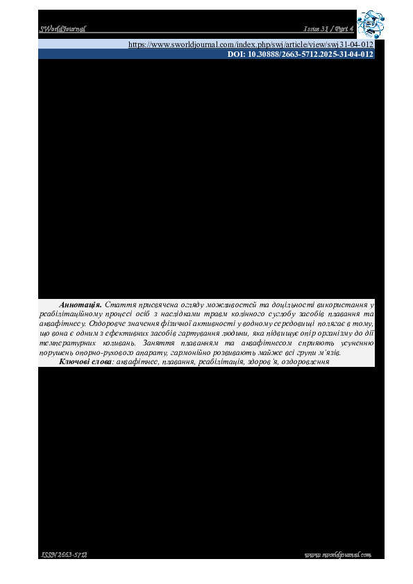 | Назва: | Можливості використання засобів плавання та аквафітнесу у реабілітації осіб з посттравматичним артрозом колінного суглобу = Possibilities of using swimming and aquafitness in the rehabilitation of persons with post-traumatic knee oatherossis |
