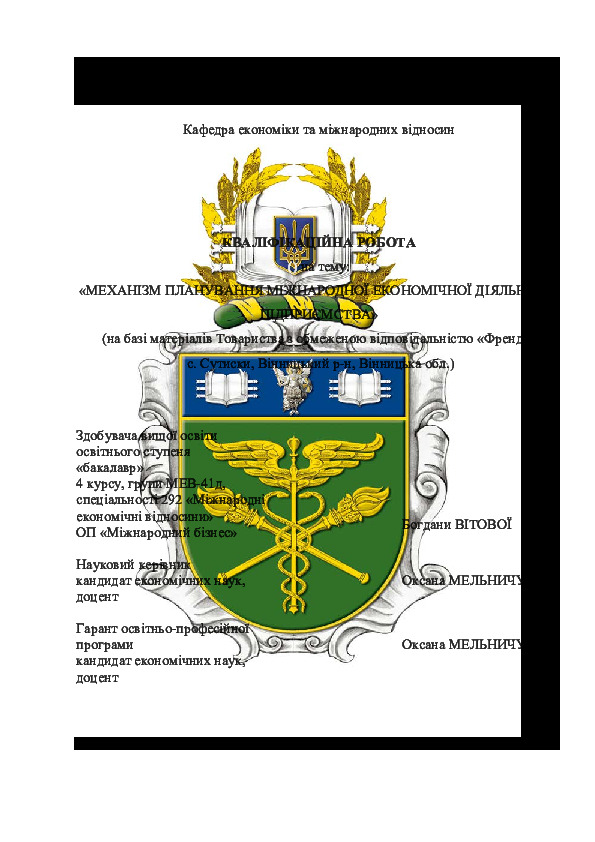 | Title: | Механізм планування міжнародної економічної діяльності підприємства (на базі матеріалів Товариство з обмеженою відповідальністю «Френдт» с. Сутиски, Вінницький р-н, Вінницька обл.) |
