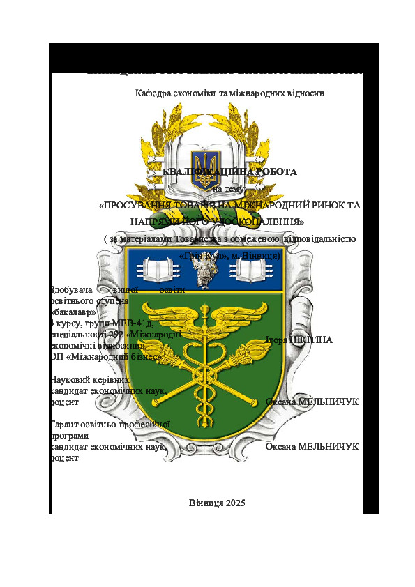 | Title: | Просування товарів на міжнародний ринок та напрями його удосконалення ( за матеріалами Товариства з обмеженою відповідальністю «Грін Кул», м. Вінниця) |