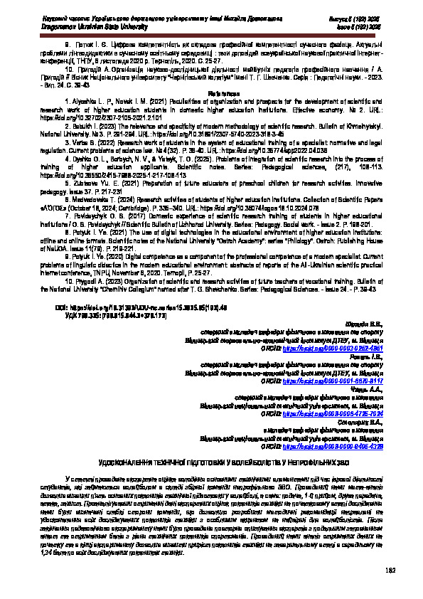 | Видавництво: | Науковий часопис Українського державного університету імені Михайла Драгоманова. Серія 15. Науково-педагогічні проблеми фізичної культури (фізична культура і спорт). 2025. Випуск 5(192). С. 182-186. |