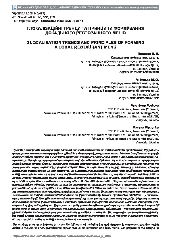| Назва: | Глокалізаційні тренди та принципи формування локального ресторанного меню = Glocalisation trends and principles of forming a local restaurant menu |