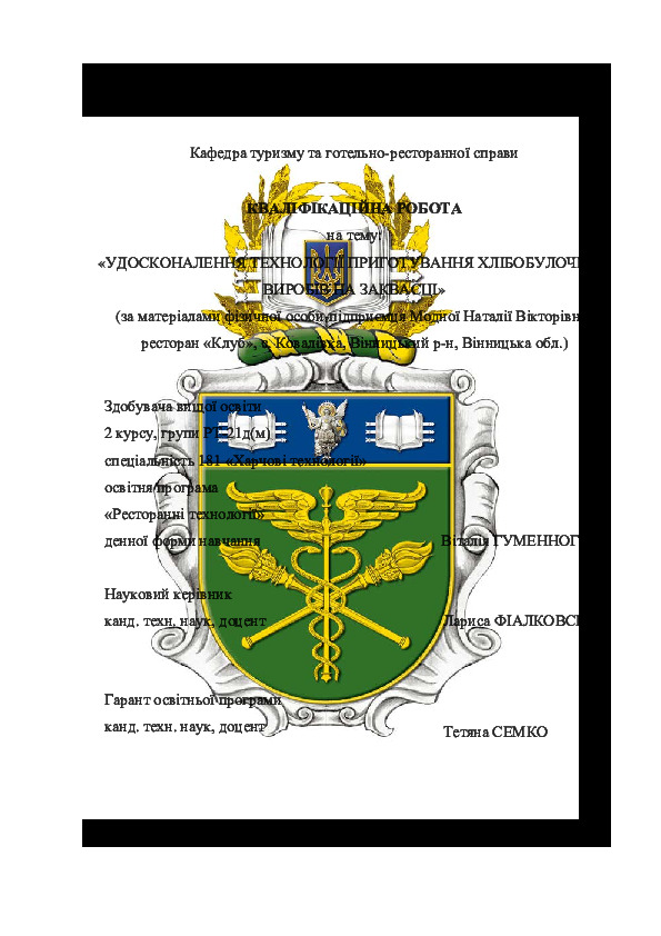 | Title: | Удосконалення технології приготування хлібобулочних виробів на заквасці (за матеріалами фізичної особи-підприємця Модної Наталії Вікторівни, ресторан «Клуб», с. Ковалівка, Вінницький р-н, Вінницька обл.) |