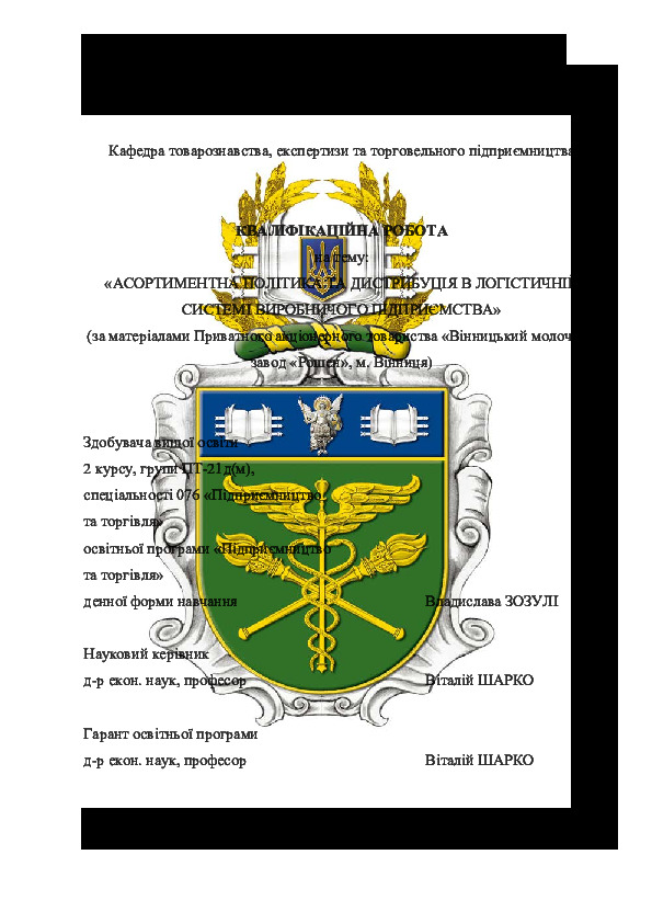 | Title: | Асортиментна політика та дистрибуція в логістичній системі виробничого підприємства (за матеріалами Приватного акціонерного товариства «Вінницький молочний завод «Рошен», м. Вінниця) |