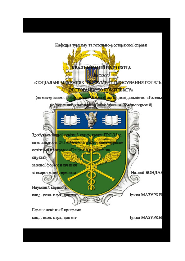 | Title: | Соціальні мережі як інструмент просування готельно-ресторанного комплексу (за матеріалами Товариства з обмеженою відповідальністю «Готельно-ресторанний комплекс «Собкофф»», м. Хмельницький) |