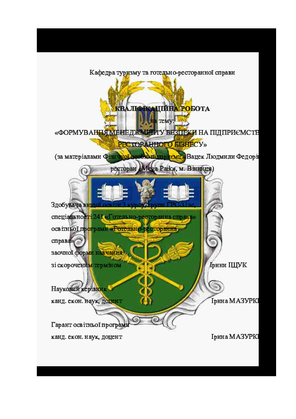 | Title: | Формування менеджменту безпеки на підприємствах ресторанного бізнесу (за матеріалами Фізичної особи-підприємця Вацек Людмили Федорівни, ресторан «Megа Park», м. Вінниця) |