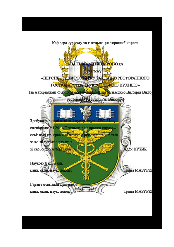 | Title: | Перспективи розвитку закладів ресторанного господарства із українською кухнею (за матеріалами Фізичної особи-підприємця Кузьменко Вікторія Вікторівна, ресторан «Tereveni», м. Вінниця) |