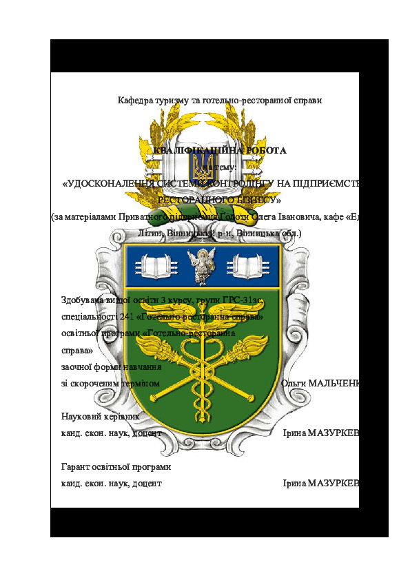 | Title: | Удосконалення системи контролінгу на підприємствах ресторанного бізнесу (за матеріалами Приватного підприємця Голоти Олега Івановича, кафе «Едем», с. Літин, Вінницький р-н, Вінницька обл.) |