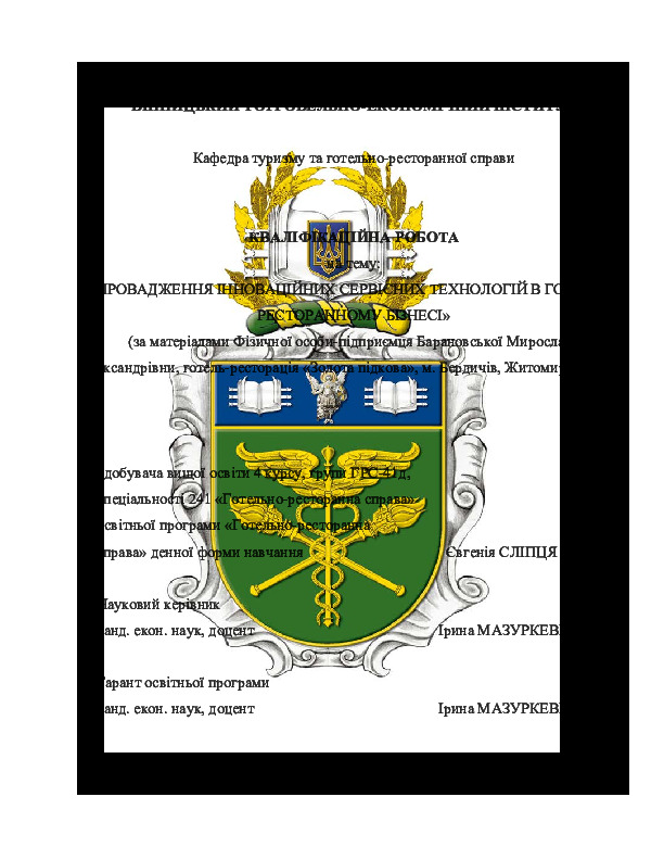 | Title: | Впровадження інноваційних сервісних технологій в готельно-ресторанному бізнесі (за матеріалами Фізичної особи-підприємця Барановської Мирослави Олександрівни, готель-ресторація «Золота підкова», м. Бердичів, Житомирська обл.) |