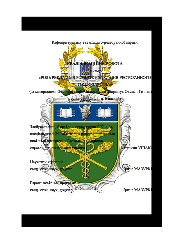 | Title: | Роль реклами в розвитку закладів ресторанного господарства (за матеріалами Фізичної особи-підприємця Збаращук Оксани Геннадіївни, студія-бар «City», м. Вінниця) |