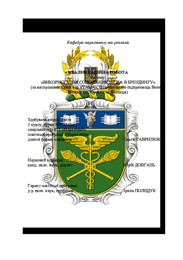 | Title: | Використання соціальних медіа в брендингу (за матеріалами Суши бар «YAMA», Фізична особа-підприємець Возний Віталій Вікторович, м. Вінниця) |