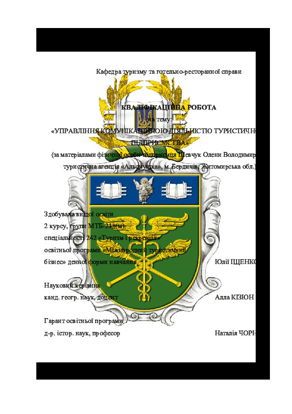 | Title: | Управління комунікаційною діяльністю туристичного підпраємства (за матеріалами фізичної особи-підприємця Шевчук Олени Володимирівни, туристична агенція «Альонушка», м. Бердичів, Житомирська обл.) |