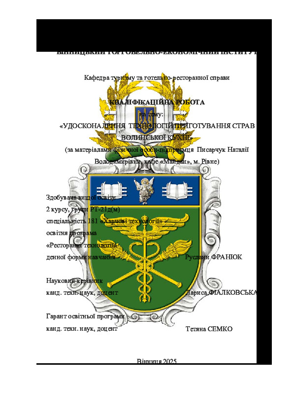 | Title: | Удосконалення технологій приготування страв волинської кухні (за матеріалами фізичної особи-підприємця Писарчук Наталії Володимирівни, кафе «Майдан», м. Рівне) |