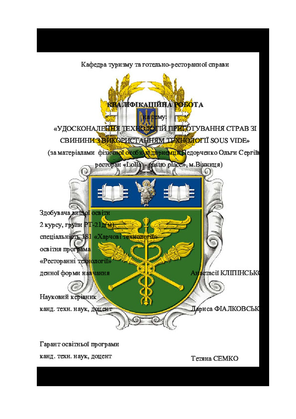 | Title: | Удосконалення технологій приготування страв зі свинини з використанням технології sous vide (за матеріалами фізичної особи-підприємця Педорченко Ольги Сергіївни, ресторан «Lolla - gastro place», м.Вінниця) |