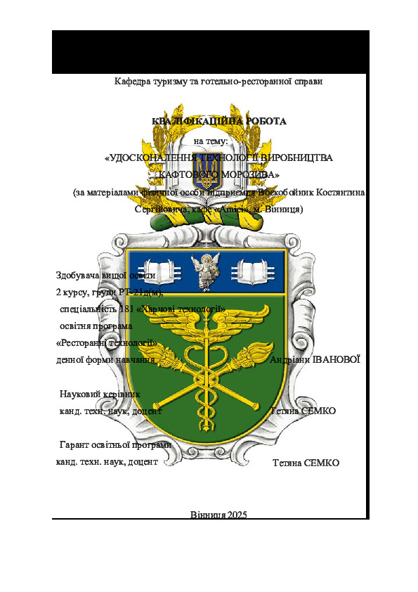 | Title: | Удосконалення технології виробництва кафтового морозива (за матеріалами фізичної особи підприємця Воскобойник Костянтина Сергійовича, кафе «Аmici», м. Вінниця) |
