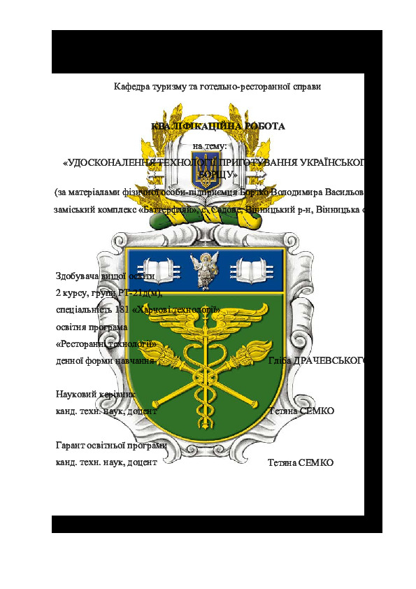 | Title: | Удосконалення технології приготування українського борщу (за матеріалами фізичної особи-підприємця Бортко Володимира Васильовича, заміський комплекс «Баттерфляй», с. Садове, Вінницький р-н, Вінницька обл.) |