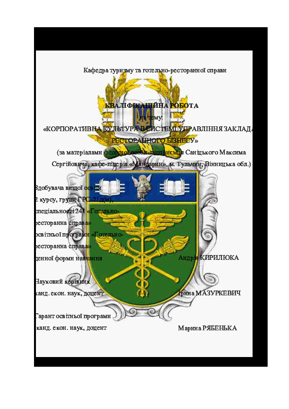 | Title: | Корпоративна культура в системі управління закладами ресторанного бізнесу (за матеріалами фізичної особи-підприємця Саніцького Максима Сергійовича, кафе-піцерія «Мандарин», м. Тульчин, Вінницька обл.) |