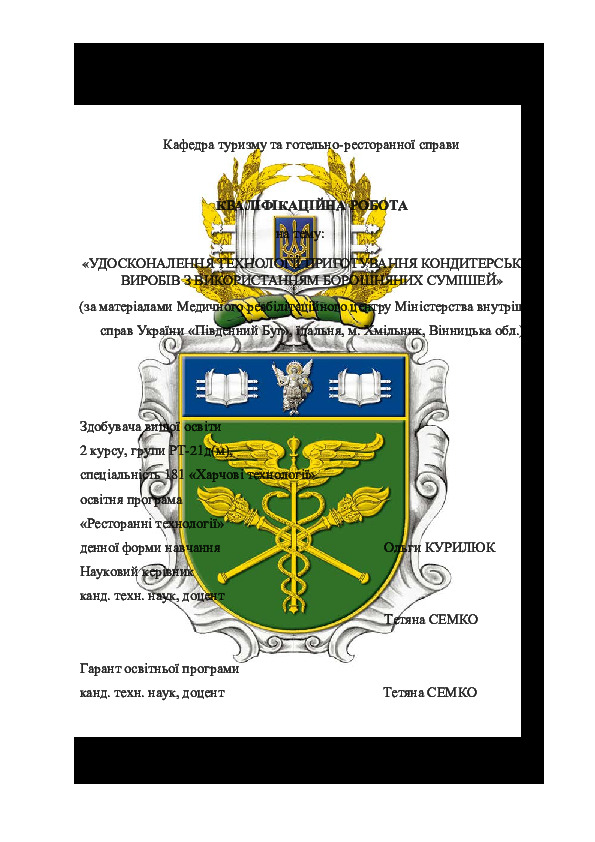 | Title: | Удосконалення технології приготування кондитерських виробів з використанням борошняних сумішей(за матеріалами Медичного реабілітаційного центру Міністерства внутрішніх справ України «Південний Буг», їдальня, м. Хмільник, Вінницька обл.) |