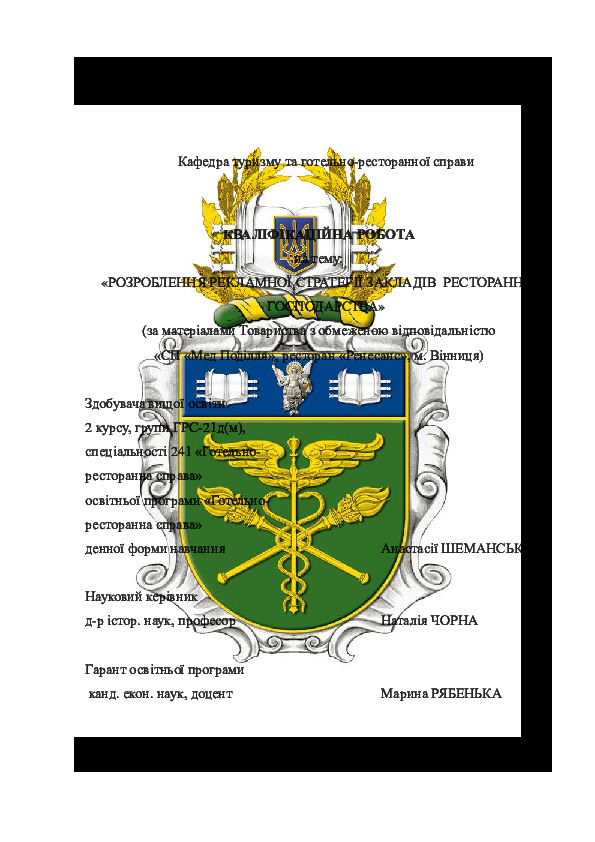 | Title: | Розроблення рекламної стратегії закладів ресторанного господарства (за матеріалами Товариства з обмеженою відповідальністю «СП «Мед Поділля», ресторан «Ренесанс», м. Вінниця) |