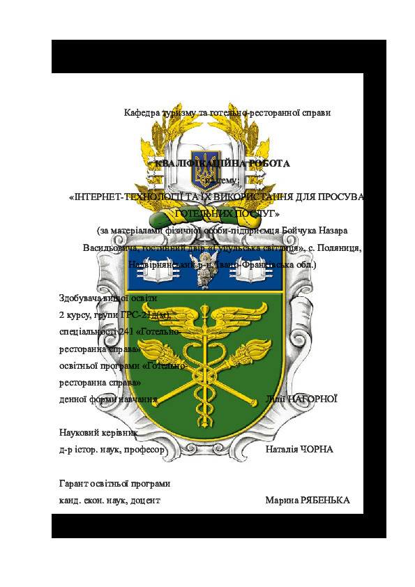 | Title: | Інтернет-технології та їх використання для просування готельних послуг (за матеріалами фізичної особи-підприємця Бойчука Назара Васильовича, гостинний двір «Гуцульська світлиця», с. Поляниця, Надвірнянський р-н, Івано-Франківська обл.) |